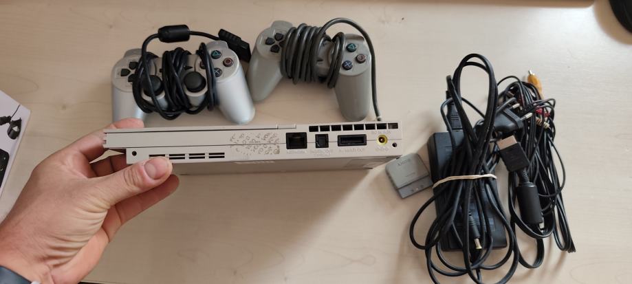 Serbrni set: konzola, 1 dualshock joystik, 1 običan, orginal Sony napajanje, kabel za spajanje sa TV-om.