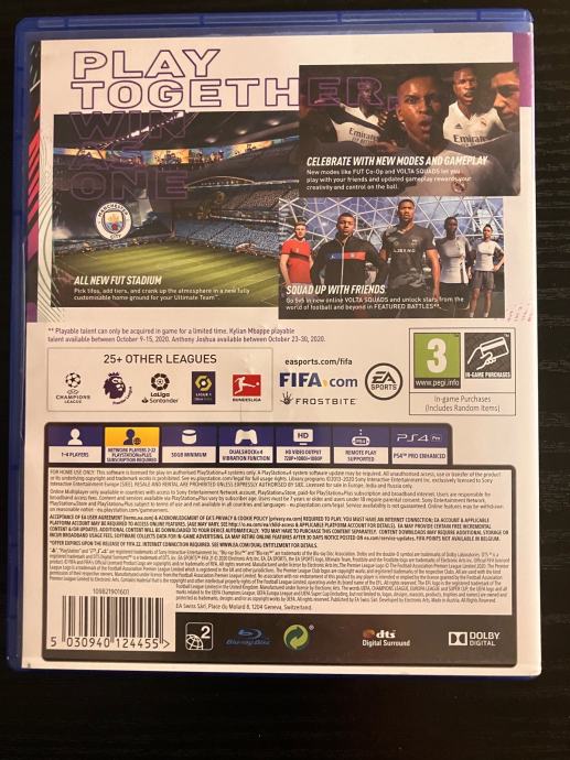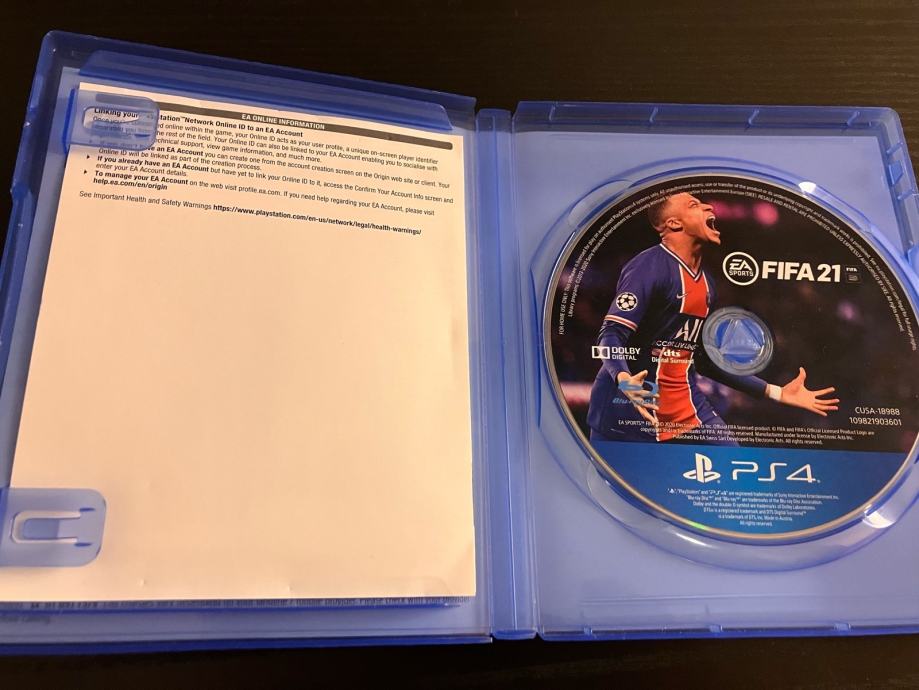 FIFA 21 - PS4 igra. Super stanje- 5 fotografija je u oglasu. Cijena je 21 EUR za osobno preuzimanje u Popovači, a troškovi slanja su dodatna 3 EUR Tiskom ili 4 EUR Poštom za unaprijed uplatu na račun ili 6 EUR za plaćanje pouzećem. Box Now slanje je 2 EUR. Pakiram tako da je sigurno u transportu. Odgovaram na pozive, poruke putem Njuškala, SMS, Viber.