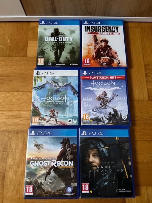 Prodajem kolekciju PlayStation 4 igara, ukupno šest naslova. U ponudi su Call of Duty: Modern Warfare Remastered, Insurgency: Sandstorm, Horizon Forbidden West (PS5 verzija), Horizon Zero Dawn Complete Edition (PlayStation Hits izdanje), Tom Clancy's Ghost Recon Wildlands i Death Stranding. Sve igre su za PlayStation 4, osim jedne Horizon igre koja je za PS5 . Cijena se odnosi na svaku posebno ako uzimate vise onda moze jeftinije