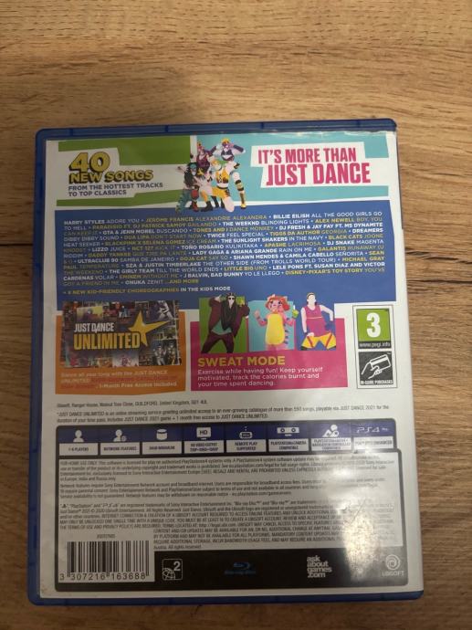 Prodajem Just Dance 2021 za PlayStation 4. Igra dolazi s više od 550 pjesama putem Just Dance Unlimited usluge, a uključuje 40 novih pjesama od poznatih izvođača kao što su Harry Styles, Billie Eilish, Lady Gaga & Ariana Grande, Dua Lipa, The Weeknd, Doja Cat i mnogi drugi. Igra podržava korištenje mobitela kao kontrolera, a sadrži i Kids Mode te Sweat Mode za vježbanje uz ples.