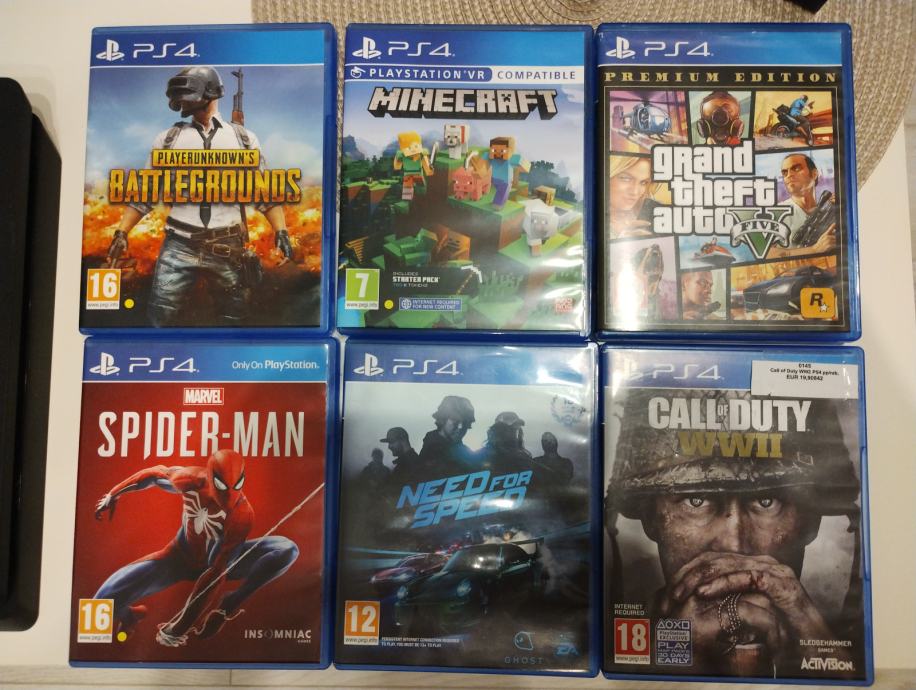 PS4 prodaje se sa jednim kontrolerom+kabl, kablom za napajanje konzole, punjač za 2 kontrolera sa kablom+punjač, dvije silikonske maskice za kontroler i 6 igrica.