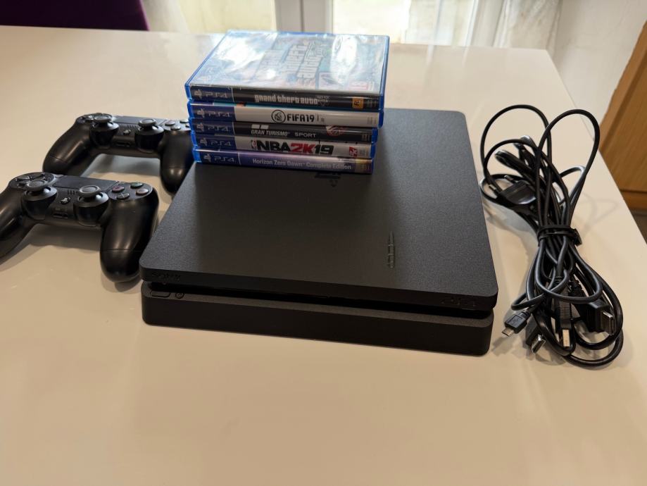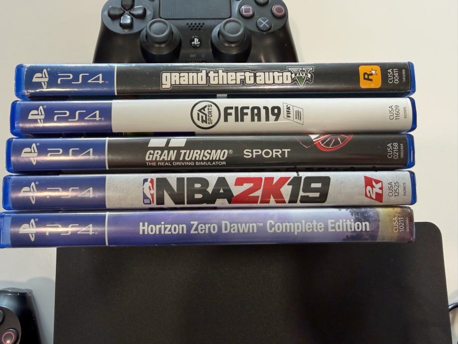 Prodajem PlayStation 4 Slim u crnoj boji. U paketu dolaze dva DualShock 4 kontrolera, potrebni kablovi te pet igara: Grand Theft Auto V, FIFA 19, Gran Turismo Sport, NBA 2K19 i Horizon Zero Dawn Complete Edition.