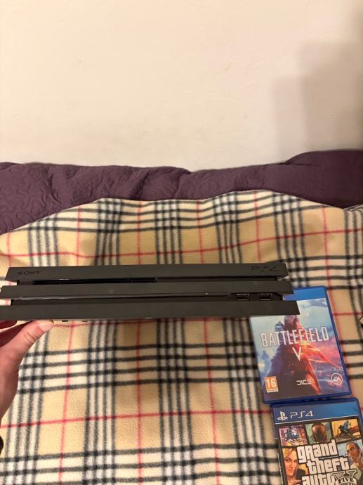 Prodajem rabljeni PlayStation 4 Pro s 1TB memorije u odličnom stanju i u kompletu s 1 joystickom i 2 igre (GTA 5 i Battlefield 5). Konzola je potpuno ispravna i dolazi s originalnim kablovima za napajanje i povezivanje (original kabel za struju, Sony kabel za punjenje joysticka i HDMI kabel).