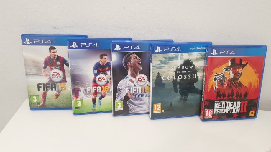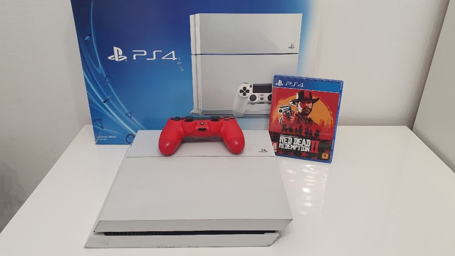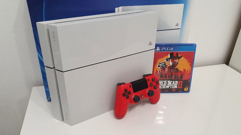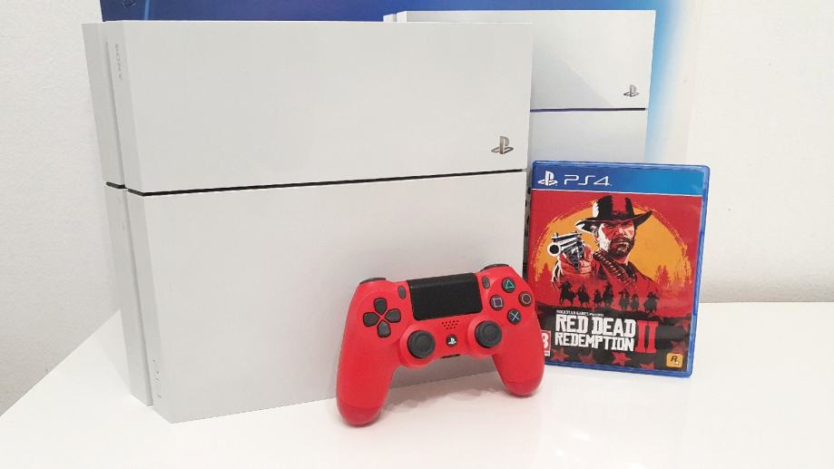 Prodajem rabljeni bijeli PS4 s 500 gb diskom, crvenim novim dualshock 4 v2 kontrolerom i par igara (Red Dead Redemption 2, par Fifa, Shadow of Colossus) Dostava moguca u Krapinsko Zagorskoj Županiji i Zagrebu.