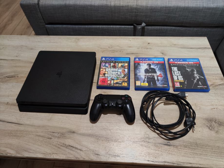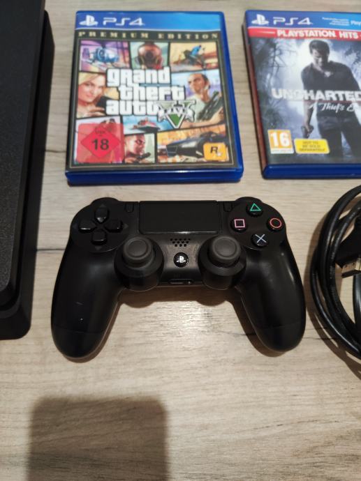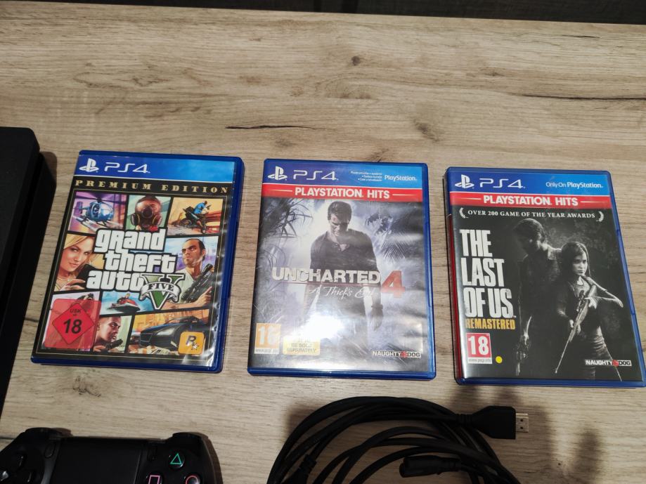 Uz konzolu dolazi 1 originalni DualShock kontroler, kabel za napajanje i hdmi kabel. 3 igrice - GTA V Premium Edition, Uncharted 4 i Last Of Us Remastered.