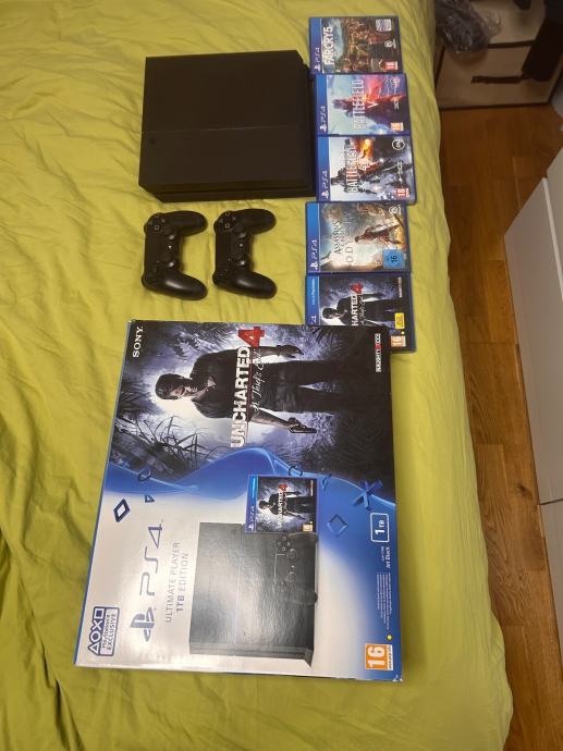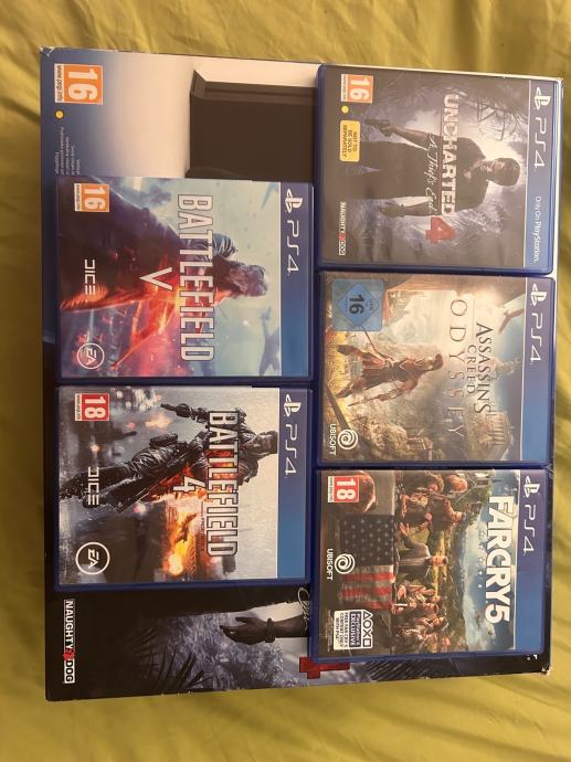 PS4 u odličnom stanju, potpuno ispravan, vrlo malo korišten. Koristila ga odrasla osoba ( ja ), a ne djeca. Korišten kada sam imao slobodnog vremena, a imao sam ga malo. Uz njega idu dva originalna PS kontrolera, kabel napajanja, kabel za punjenje kontrolera i pet igara, sve vidljivo na slikama. Isporuka u originalnoj kutiji kao kada je kupljen pa je pogodan i kao poklon.