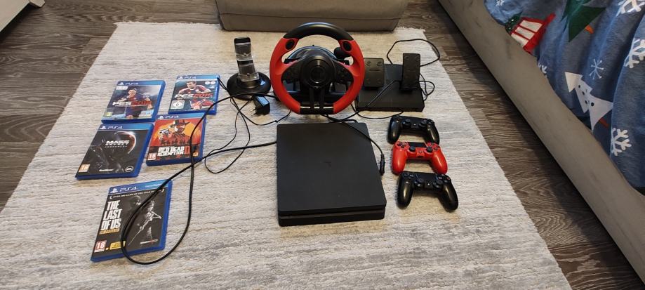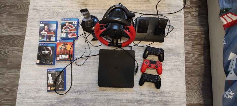 Prodajem ps4 konzolu sa 3 kontrolera, stanicom za punjenje, nekoliko igrica(sa slike), volanom i pedalama(speedlink trailblazer)...