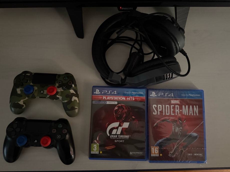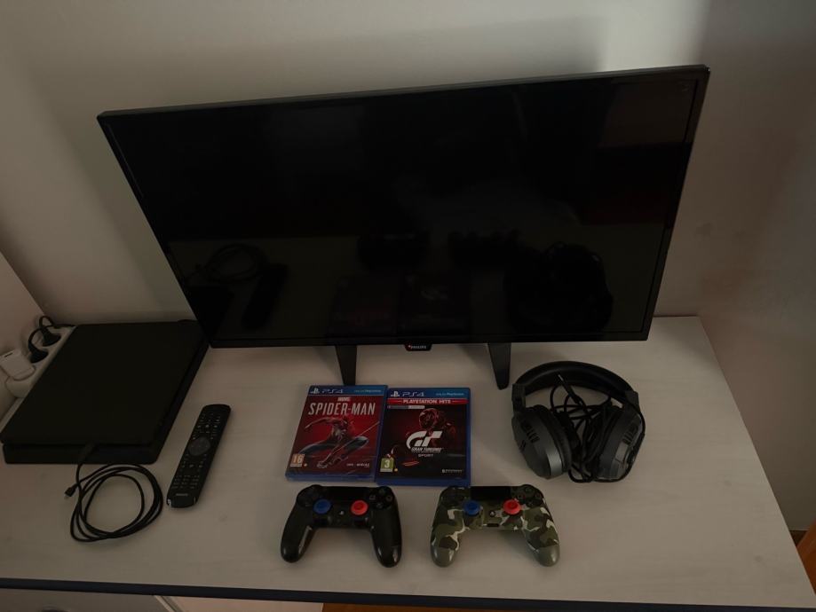 Prodajem rabljeni PlayStation 4 komplet koji uključuje konzolu, televizor, 2 kontrolera, slušalice i 2 igrice (Spider-Man i GT Sport). Set je u dobrom stanju i spreman za igranje, idealan za ljubitelje PlayStation igara.