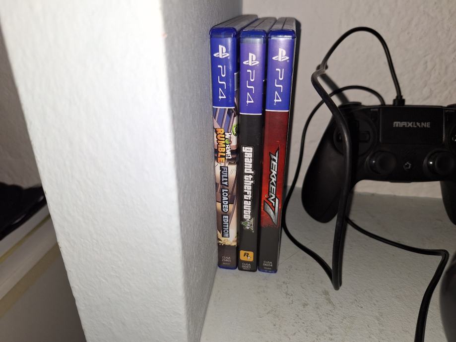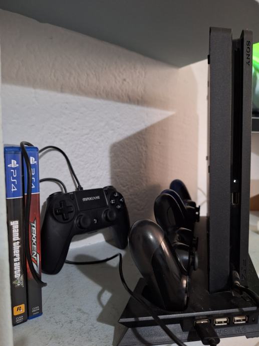 ps4 sa postoljem koje ima ventilatore za hlađenje punjaca dva za orginal yoistike i tri usb punjaca za druge yoistike,tri igrice na cd-u i jedno 30 igrica na njemu,sa 3 yoistika