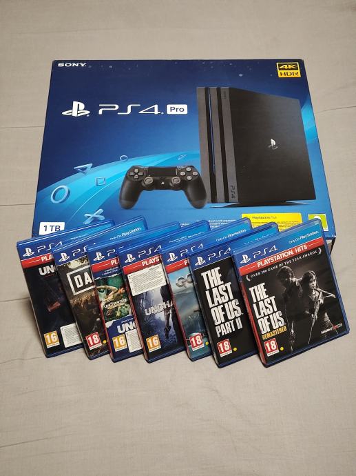 Prodajem Sony PlayStation 4 Pro 1TB s jednim kontrolerom i 7 originalnih igrica (jedne on najpopularnijih) - God of War, The Last of Us 1&2, Uncharted Nathan Drake Collection (1,2 &3), Uncharted 4 (A Thief's End), Uncharted (Tge Lost Legacy) i Days Gone.