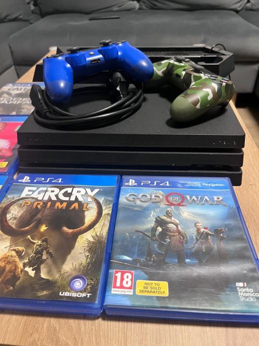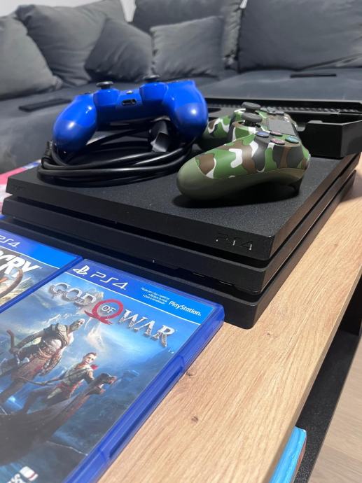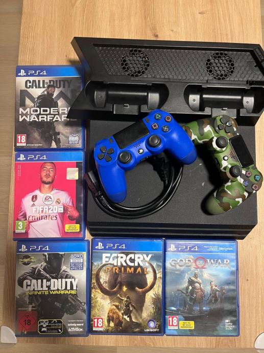 Prodajem rabljenu PlayStation 4 PRO konzolu s kapacitetom od 1TB u dobrom stanju. Uz konzolu dolaze dva kontrolera (plavi i maskirni) te nekoliko popularnih igara uključujući God of War, Far Cry Primal i Call of Duty. Uz to prodajem i ventilator za hlađenje koji je malo premali za ps4, stane, ali ne u potpunosti, koristio se samo za punjenje joysticka.