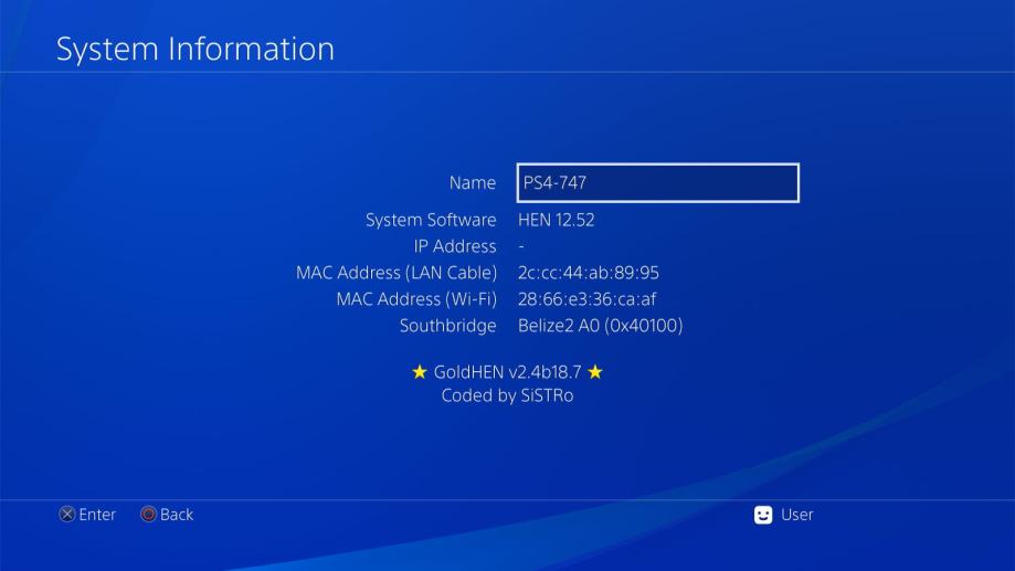 Verzija firmwarea je 12.52 što je zadnja dostupna verzija za modifikaciju i pokreće se putem blu ray diska koji dolazi uz konzolu. Trenunto ima instaliranih 75 igrica, a moguće je skinuti preko 6000 dostupnih igrica za Playstaion 4. Također moguće je pomoću emulatora igrati igre za PS1, PS2, PSP i starije popust NES, SNES, SEGA ...