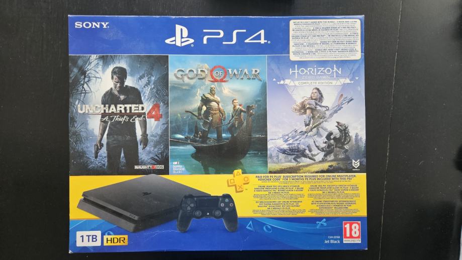 Prodajem PlayStation 4 Slim (zadnji model) s 1TB prostora za pohranu, u crnoj boji (Jet Black). Uz konzolu dolaze 2 DualShock kontrolera, 9 igara, punjač za kontrolere i slušalica za joystick (nije nikada korištena).