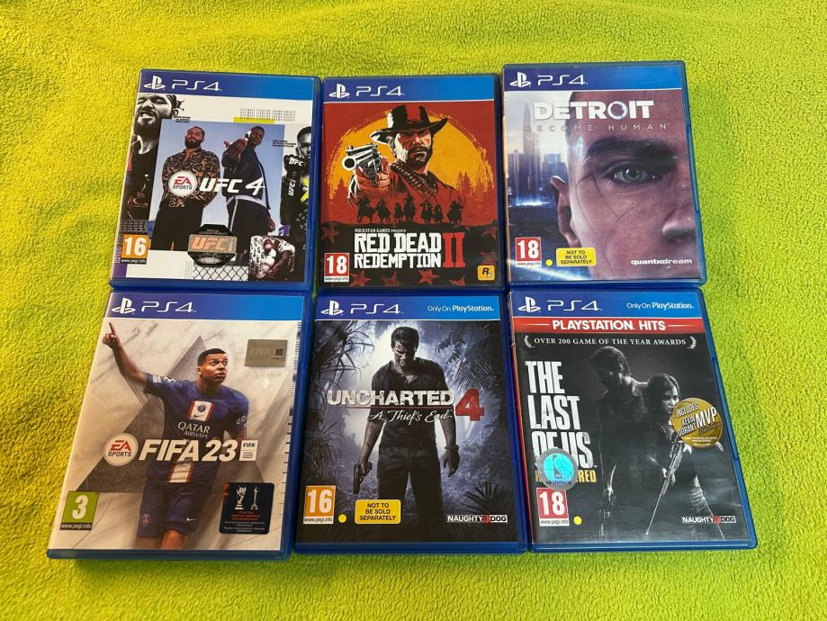 - 7 igrica (Detroit: Become Human, Red Dead Red 2, Uncharted 4: A Thief's End, UFC 4, The Last Of Us 1 Remastered. Fifa 23, Crash Bandicoot N. Sane Trilogy - JEDINO NJOJ NEMREM NACI KUTIJICU)