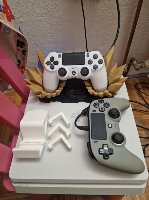 PS4 slim bijeli. Očišćen i stavljena nova termalna pasta.Dolazi sa dva joysticka, jedan Nacon. Nosači za zid i dva držača za joystick.