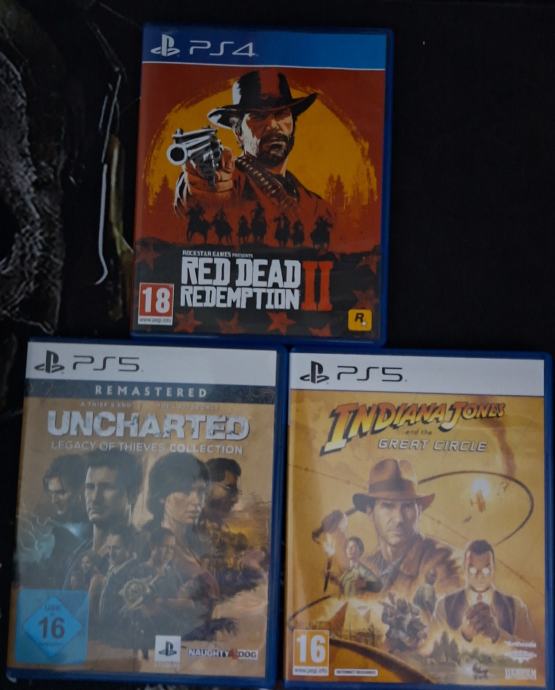 Prodajem tri igrice za PlayStation. U paketu se nalaze Red Dead Redemption 2 za PS4, Uncharted: Legacy of Thieves Collection (Remastered) za PS5 te Indiana Jones and the Great Circle za PS5. Stanje kao novo igrano jako malo
