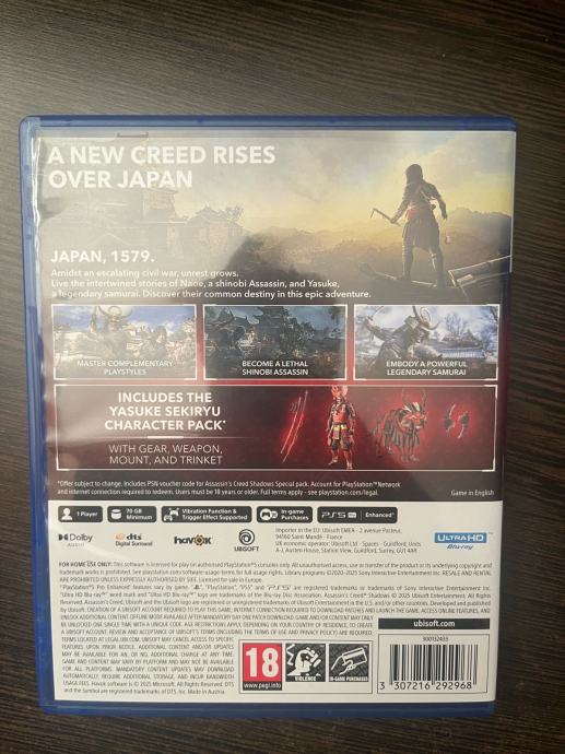 Prodajem Assassin's Creed Shadows Special Edition za PlayStation 5. Igra je smještena u feudalni Japan 1579. godine i donosi avanturu kroz epsko razdoblje samurajske povijesti. Special Edition uključuje dodatni digitalni sadržaj – Throwing Dagger Season Pass set oružja, Shadows Hideout paket i Legends Character Pack s odjećom, oružjem, držanjem i privjeskom.