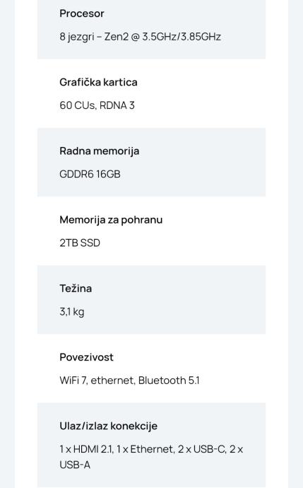 Konzola nudi WiFi 7, ethernet i Bluetooth 5.1 povezivost. Priključci uključuju 1x HDMI 2.1, 1x Ethernet te 2x USB-C i 2x USB-A porta. Težina konzole je 3,1 kg.