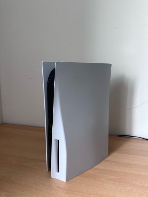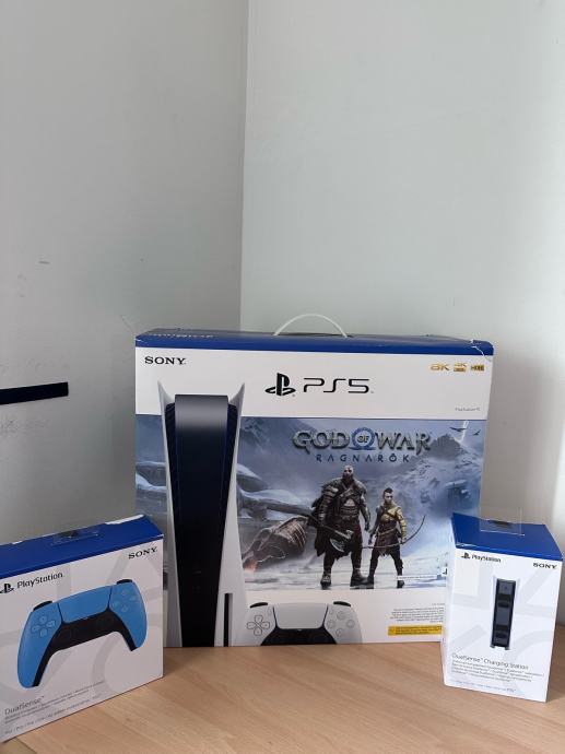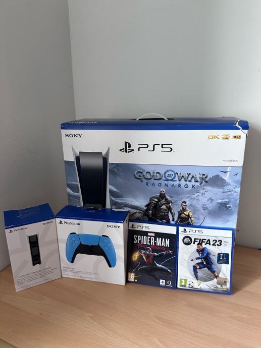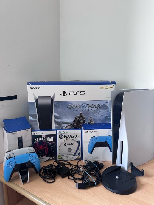 Prodajem rabljeni PlayStation 5, dvije igre, poseban punjac za kontrolere i plavi kontroler.