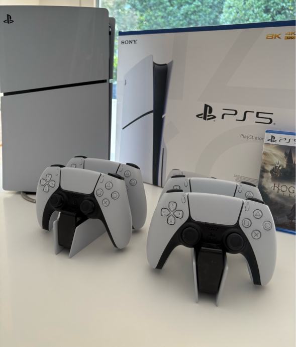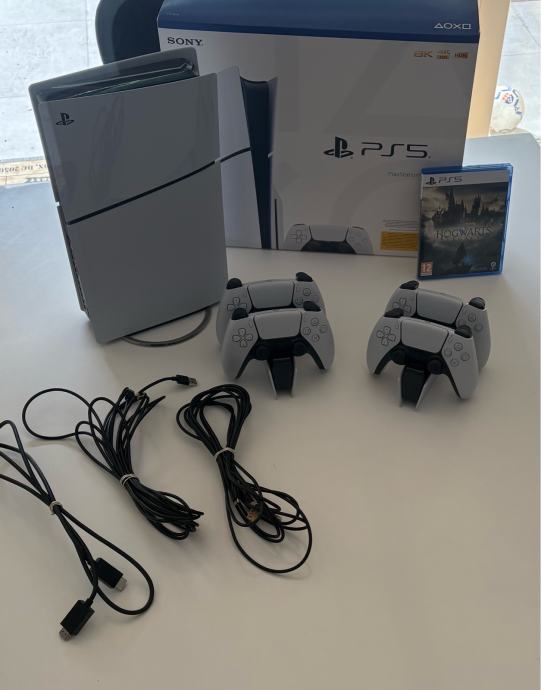 Prodajem PlayStation 5 Slim konzolu u bijeloj boji, s čitačem diskova. Uz konzolu dolaze četiri DualSense kontrolera, dvije stanice za punjenje kontrolera, svi potrebni kabeli te igra Hogwarts Legacy. Originalana kutija je također uključena.
