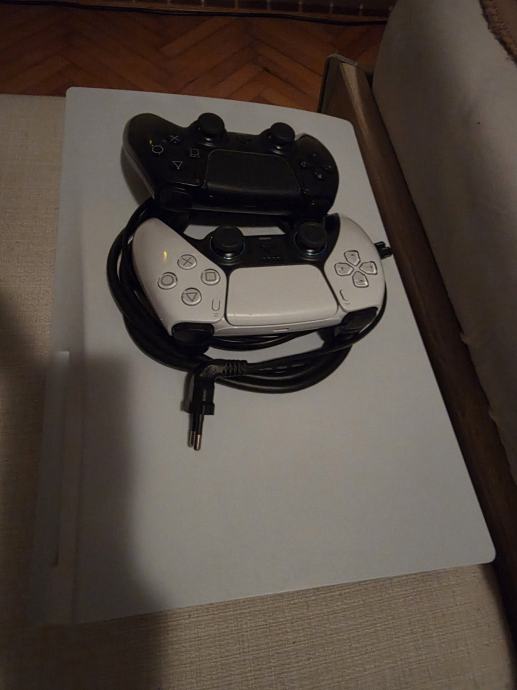 Prodajem Sony PlayStation 5 konzolu s čitačem diskova. U kompletu dolazi originalni bijeli DualSense kontroler, dodatni crni kontroler te kabel za napajanje i HDMI 8K kabel.