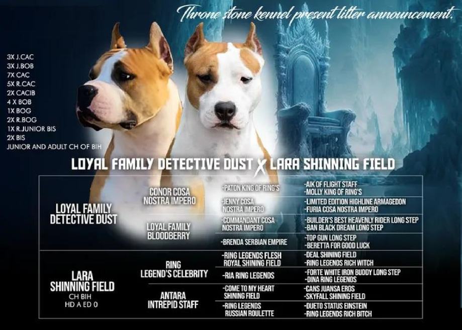 Dostupna vrlo perspektivna zenka americkog staford, terijera iz registrirane uzgajivacnice Throne Stone FCI 29/2023 od odlicnih roditelja.