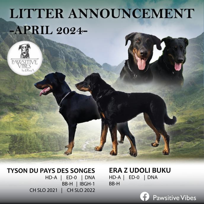 U uzgajivačnici PAWSITIVE VIBES imamo na raspolaganju štence Beaucerona s rodovnicom - jednog mužjaka i jednu ženku. Štenci su oštenjeni 24. travnja 2024. godine i nakon 19. lipnja bit će spremni za odlazak u svoje nove domove. Bit će mikročipirani, cijepljeni, imati EU putovnicu i rodovnicu prije izložbe.