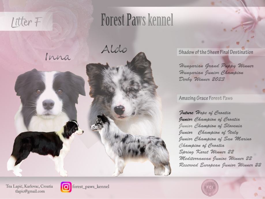 Otac je blue merle boje, iz Madarske, izlozbene kvalitete te predivnog karaktera, dok je majka legla iz našeg uzgoja, proglašena drugom najljepšom kujom 2022. godine u Europe.