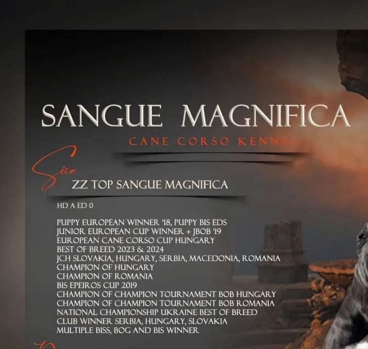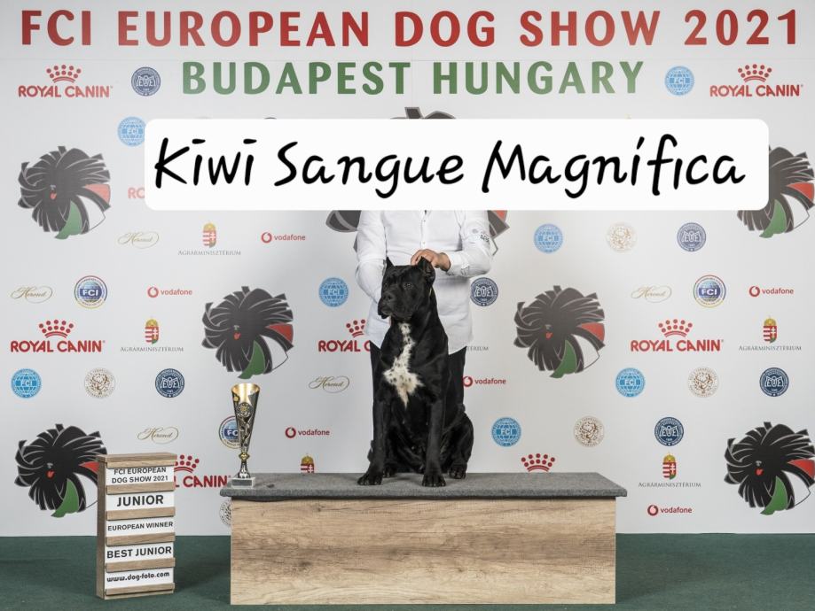 Majka Rebecca Sangue Magnífica je naša mezimica. Njeni su roditelji ZZ Top Sangue Magnífica (mnogobrojni prvak) i Kiwi Sangue Magnífica (European Dog Junior Winner 2021)