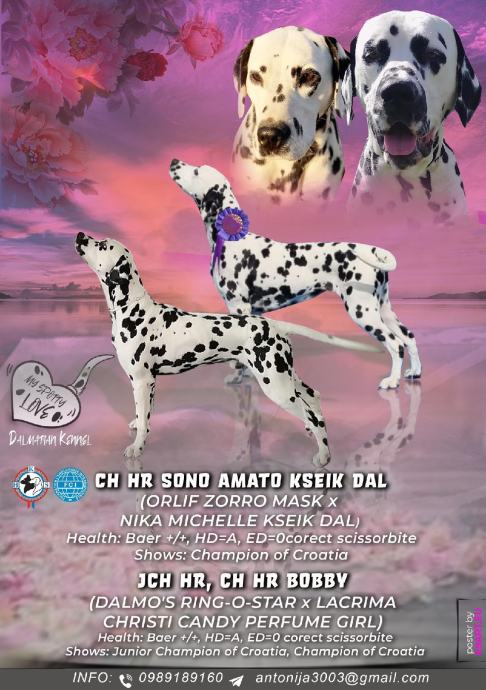 Uzgajivačnica My Spotty Love Dalmatian kennel vam s ponosom predstavlja svoje A leglo. Oštenjeni su 5.5.2023.g U leglu su 7 cura i 3 dečka. Štenci dolaze sa svim potrebnim cjepivima, čipirani, baer test i rodovnicom. Štenci će biti dostupni za novi dom početkom 7 mjeseca.