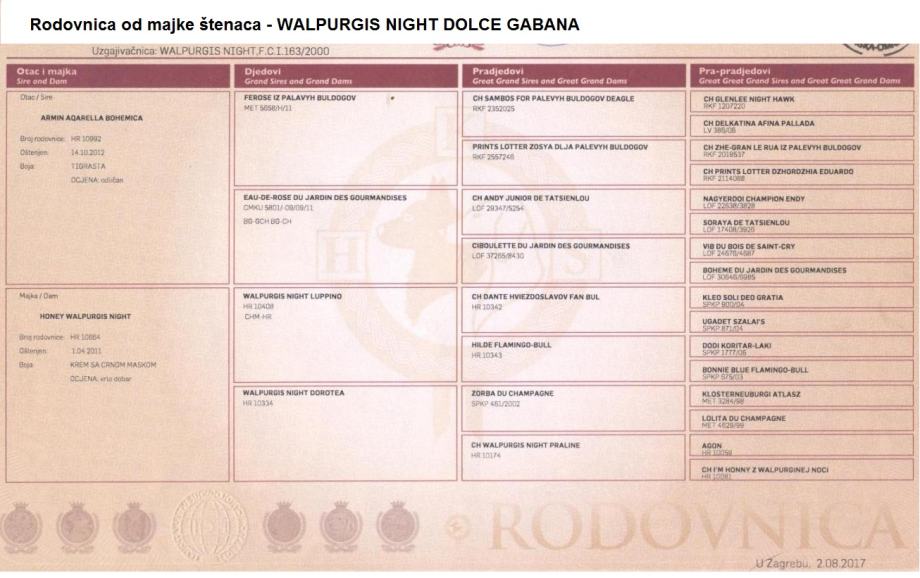 Predivno leglo, još samo 1 curica (Lyra) je slobodna. Ima 9 mjeseci, vesela, razigrana i jako umiljata. Štenci su kod nas odgajani u stanu i jako su dobro socijalizirani. Kod preuzimanja dobiti ćete hrvatsku rodovnicu HKS i EU putovnicu, štene će biti mikročipirano, 2 puta cijepljeno protiv zaraznih bolesti, više puta očišćeno od parazita, i pregledano od strane veterinara. Kupoprodajni ugovor sa garancijom, puppy paketić od uzgajivača sa svim uputama i cjeloživotna podrška sa savjetima se podrazumjevaju. Mi smo hrvatska uzgajivačnica WALPURGIS NIGHT sa 45 godišnjom tradicijom. Pridružite se i vi zadovoljnim vlasnicima naših štenaca! Za više informacija možete nas kontaktirati na br. mob. 092-3241360 (WhatsApp, Viber) ili na email: buldogmops@gmail.com