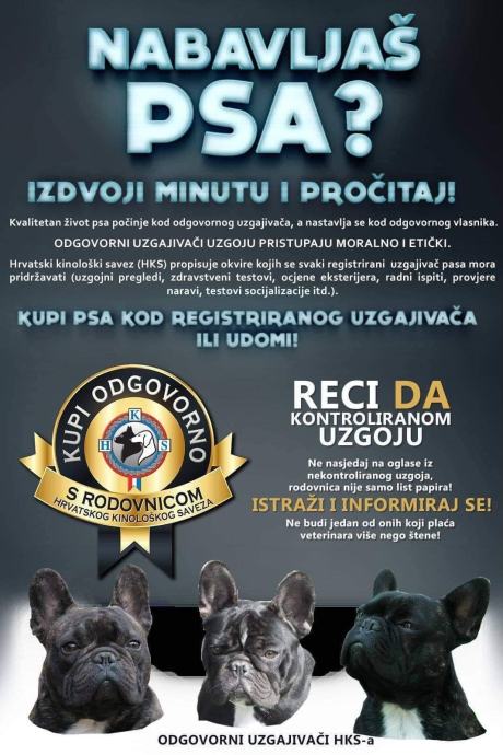 Prodajem štene Francuskog buldoga,sa FCI pedigreom,prilikom preuzimanja bit ce cijepljen,cipiran sa Eu putovnicom....ako se odlucujete za ovu pasminu,onda kupite štene od zdravih roditelja,ne na osnovu prica...mi dajemo kopije svih zdravstvenih testova od oba roditelja,mozete ih provjeriti u Animallabs gdje je obavljen zdravstveni pregled. Panel za zdravstvene-genetske testove se sastoji od 6 testova i moraju biti CLEAR da nebi bili prenosioci bolesti na svoje potomke. Tata je uvezen iz Rusije-FRUSTYLE LANDOR (iz svjetski poznate uzgajivacnice)i visestruki je champion i grand champion..mama-DICAR I'M ANATOLLE, je uvezena iz Portugala,takodjer championskog porijekla iz svjetski poznate uzgajivacnice)Ako zelite imati Francuskog buldoga zdravog,sa punim povjerenjem se javite nasoj uzgajivacnici RED DIAMOND VOM SAPO-koja je registrirana u Hrvatskom kinoloskom savezu....ako se pitate zašto je visoka cijena šteneta,to potvrdjuje kvaliteta oba roditelja šteneta i selekcija zdravlja,testirani na sve bolesti. Molim samo ozbiljne kupce koji žele imati pravog,lijepog,zdravog ljubimca da nas kontaktiraju. Mozete nas pratiti i na Facebooku koji se zove RED DIAMOND FROM SAPO.