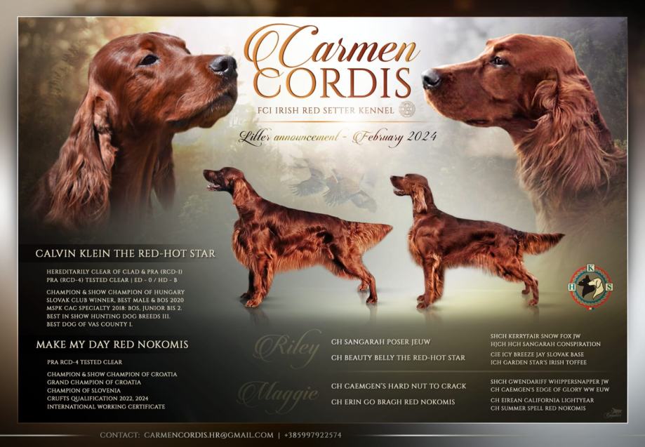Dana 22.2.2024. na svijet su stigli štenci Irskog setera, 4 dečka i 7 cura.