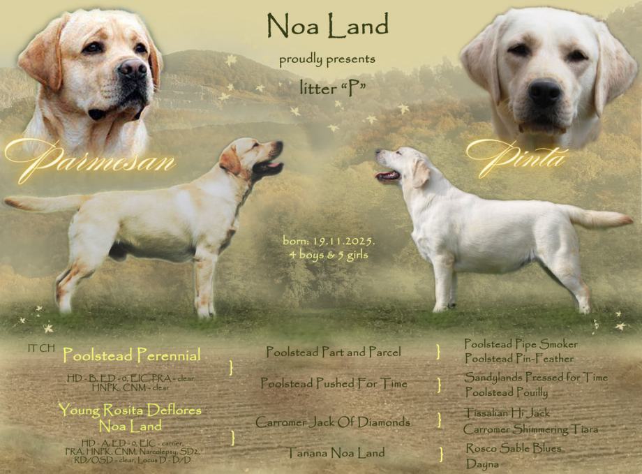 Uzgajivačnica Noa Land prima rezervacije za žute štence labrador retrivera engleskih krvnih linija, s rodovnicom Hrvatskog kinološkog saveza (FCI), koji su oštenjeni 19.11.2025. godine. Štenci će posjedovati EU putovnicu, bit će mikročipirani, više puta očišćeni od parazita i cijepljeni protiv štenećaka (zaraznih bolesti). Trenutno, primamo rezervacije za jedno muško i jedno žensko štene. Štenci će za odlazak u nove domove biti spremni sa navršenih deset tjedana starosti, točnije nakon 1.2.2026. godine. U našem domu, štenci će započeti sa procesom socijalizacije, upoznavanjem novih ljudi i druženjem s našim psima i mačkama.