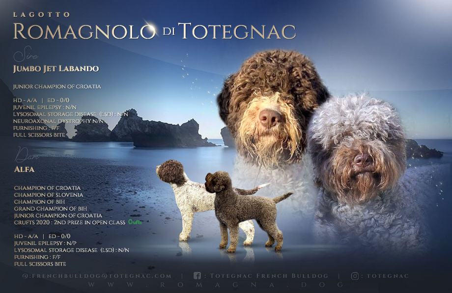 Izuzetni Lagotto Romagnolo štenci došli su na svijet u registriranoj uzgajivačnici Totegnac. Majka štenaca je višestruka šampionka u ljepoti (Hrvatske, Slovenije, BiH), drugoplasirana u klasi na najvećoj i najstarijoj izložbi pasa na svijetu (Crufts u engleskom Birminghamu) a otac štenaca je juniorski prvak Hrvatske u ljepoti. Oba roditelja imaju genetske testove iz vodećih europskih laboratorija koji jamče da njihovi štenci neće patiti od nasljednih bolesti te savršene snimke kukova i laktova s Veterinarskog fakulteta u Zagrebu. Majka je odlična i kao radni pas, jer lakoćom nalazi tartufe. Uzgajivačnica smo koja ima bogato iskustvu u odgoju još dviju pasmina, svi štenci iz naše uzgajivačnice su pomno socijalizirani, odgajeni tako da se lako priviknu na novo okruženje, na djecu i na druge pse. Svi štenci imaju rodovnike Hrvatskog kinološkog saveza, Veterinarske putovnice EU sa svim cjepivima i tretmanima protiv parazita, a uz njih novim vlasnicima dolaze i detaljne pismene upute o prehrani, držanju i odgoju pasa, temeljene na našoj dugogodišnjoj praksi uzgoja pasa koji su proglašavani najljepšima na najvećim svjetskim izložbama, ali su angažirani i u spasilačkim službama europskih zemalja te hrvatskoj policiji kao potražni psi. Više o nama na: https://www.romagnawater.dog/