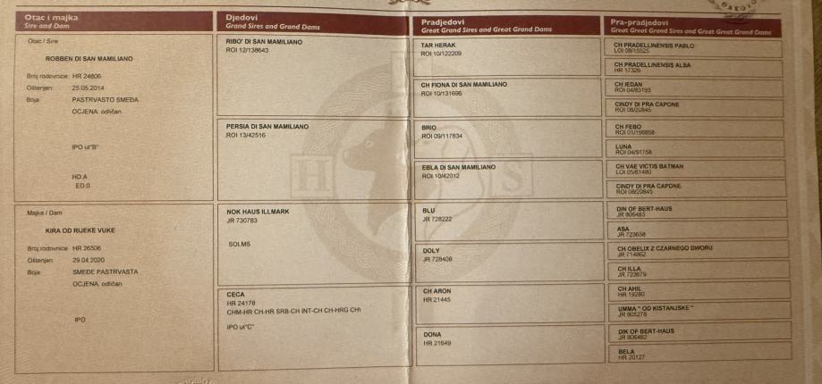 Otac: Robben di san Mamiliano - odličan pas radno i eksterijerno. Dokazani priplodnjak. Pas ima položen IPO, utakmicu B te snimak kukova i laktova. HD-A, ED-0