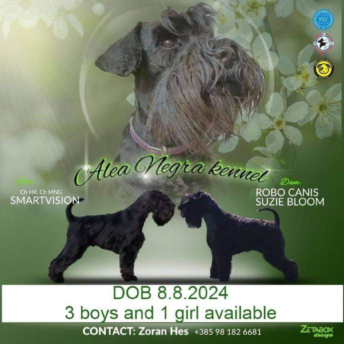 Uzgajivačnica patuljastih šnaucera Alea Negra prodaje 3 muška i 1 žensko štene crnih patuljastih šnaucera. Oštenjeni 8.8.2024. Uredno cijepljeni i čipirani, posjeduju rodovnice Hrvatskog kinološkog saveza.