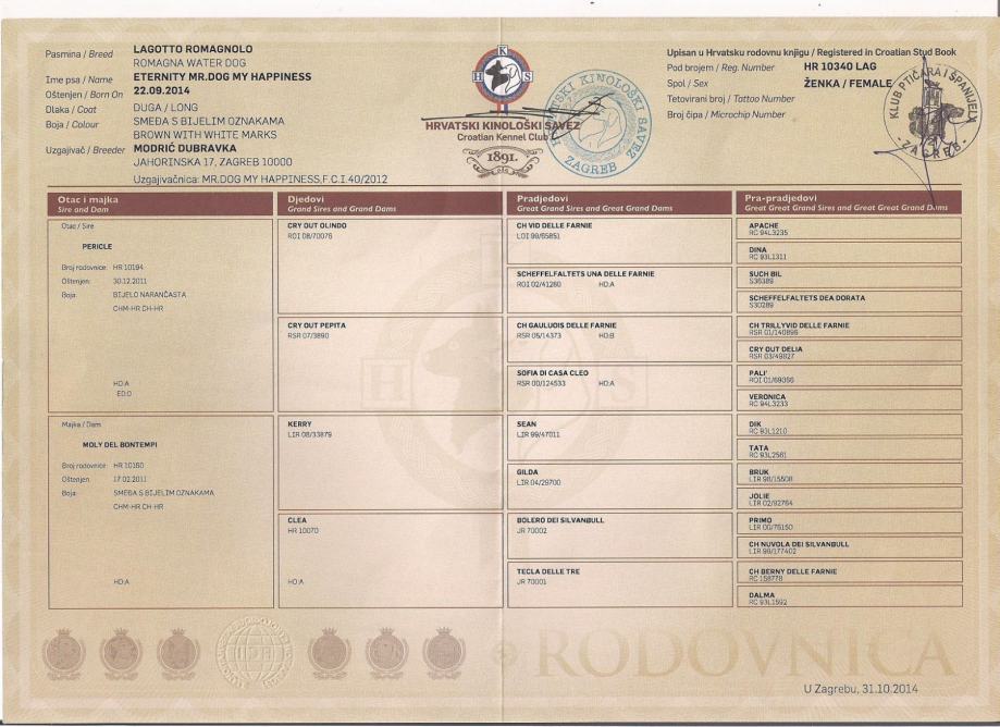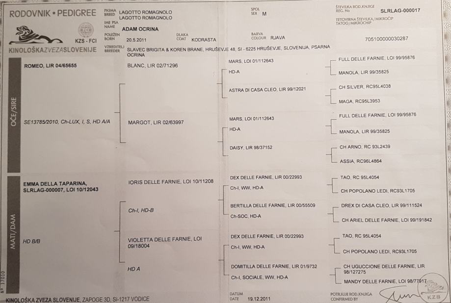 Štenci su iz izvrsne izložbeno - radne kombinacije, mama Cindy - Eternity Mr. Dog My Happiness (mlada i zrela šampionka Hrvatske) i tata Adam Ocrina (šampion Slovenije). Oba su roditelja, naročito Adam, provjereni tartufari i testirani na epilepsiju i LSD odnosno štenci sigurno neće bolovati od tih bolesti. Štenci će biti s rodovnikom, pripadajućom dokumentacijom, cijepljeni i čipirani.