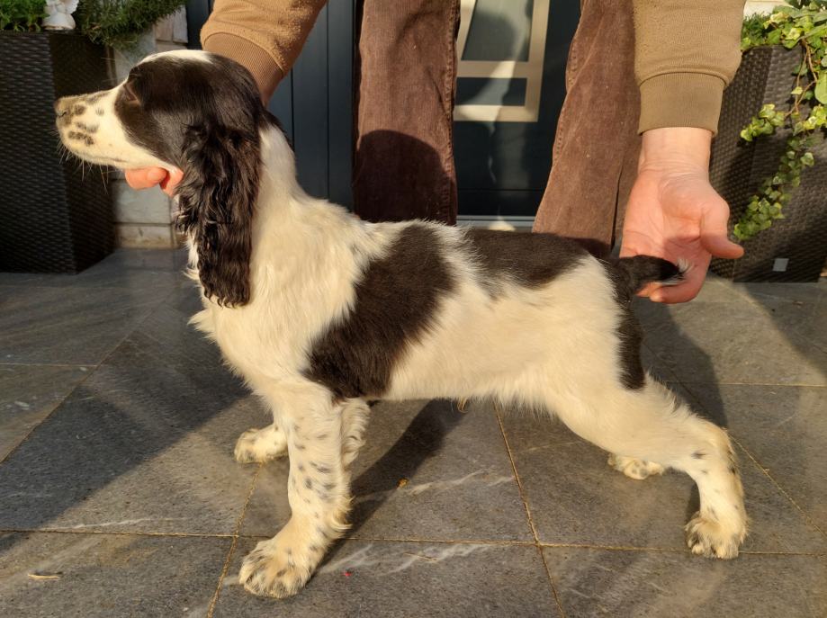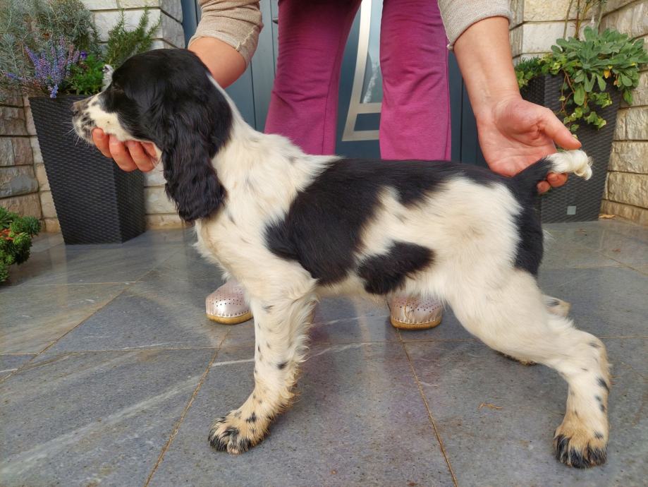 Štene je crno-bijele boje, od radnih i odlično ocijenjenih roditelja.