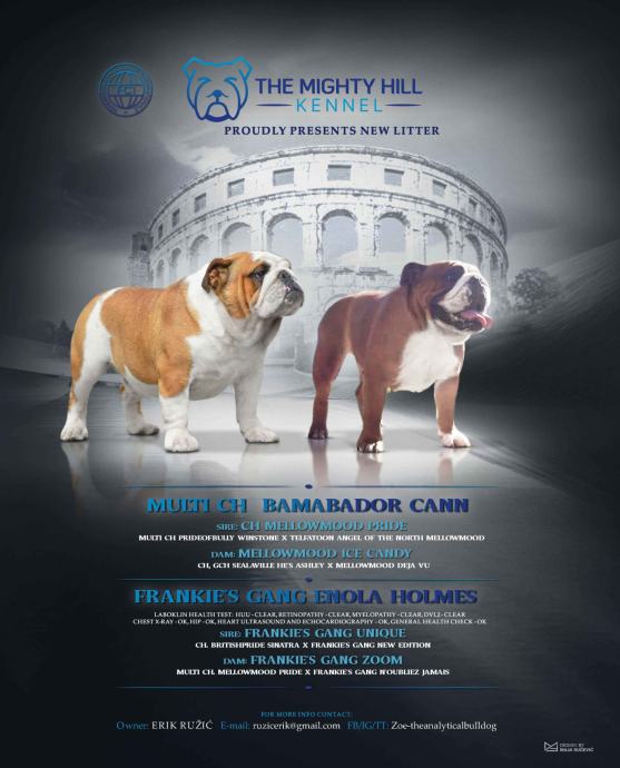 Uzgajivačnica The Mighty Hill registrirana pri HKS-u, te međunarodnoj kinološkoj organizaciji FCI s ponosom predstavlja prelijepe štence Engleskog buldoga.