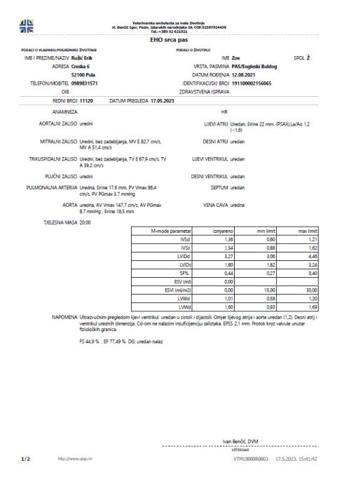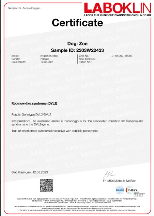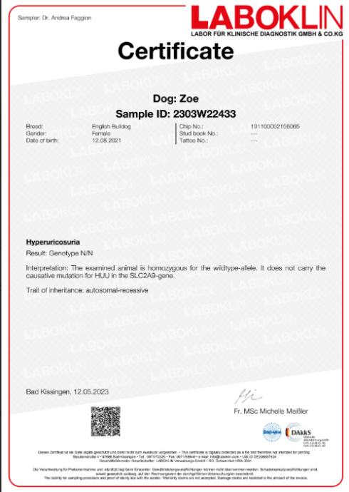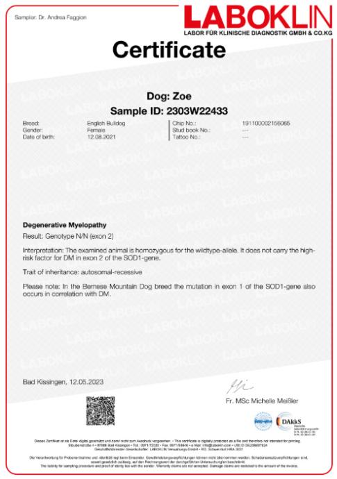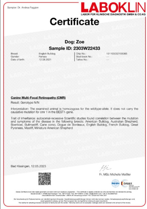 Majka legla Frankie`s Gang Enola Homes aka Zoe (Frankie`s Gang Unique x Frankie`s Gang Zoom) vrlo je zdrava ženka. Zdravlje je detaljno testirano a svi se nalazi mogu pronaći pri dnu oglasa.HUU - clear, Retinopathy - clear, Myelopathy - clear, DVL2 - clear, Chest X-ray - OK, HIP - OK, Heart ultrasound and echocardiography – OK, General Health Check - OK.