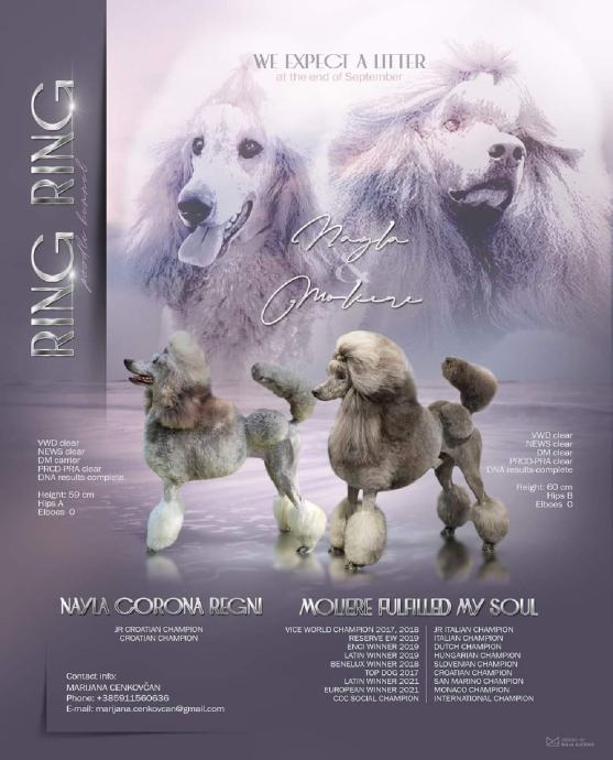 Ring Ring Iago ima vrhunsko podrijetlo, oboje roditelja su višestruki šampioni. Otac Moliere ima čak 8 šampionata, provjerni parnjak krasnih i zdravih štenaca. Izuzetnog karaktera, stabilan, miran, a opet prava pudla.