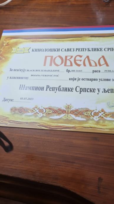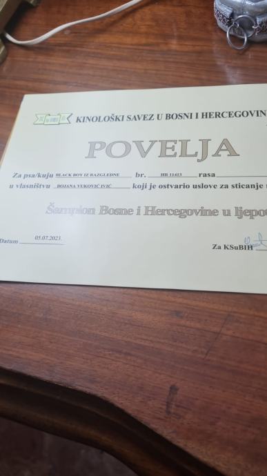 Otac pasa (Black Boy) je šampion Hrvatske, Slovenije, Bih i Republike Srpske, a mama je također iz vrhunske šampionske loze, na uzgojnoj dozvoli ocijenjena s odličnom ocjenom.