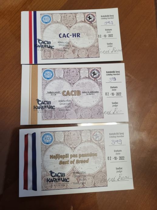 Štene je staro 5 tjedana, a preuzimanje je moguće s 2,5 mjeseca. Prije preuzimanja štene je čipirano, cijepljeno, očišćeni od parazita, ima Hr rodovnicu i putovnicu. Hrani se isključivo super premium hranom. U galeriji slika je priložena papirologija (uzgojna dozvola, rodovnici, dokazi o titulama na izložbama)