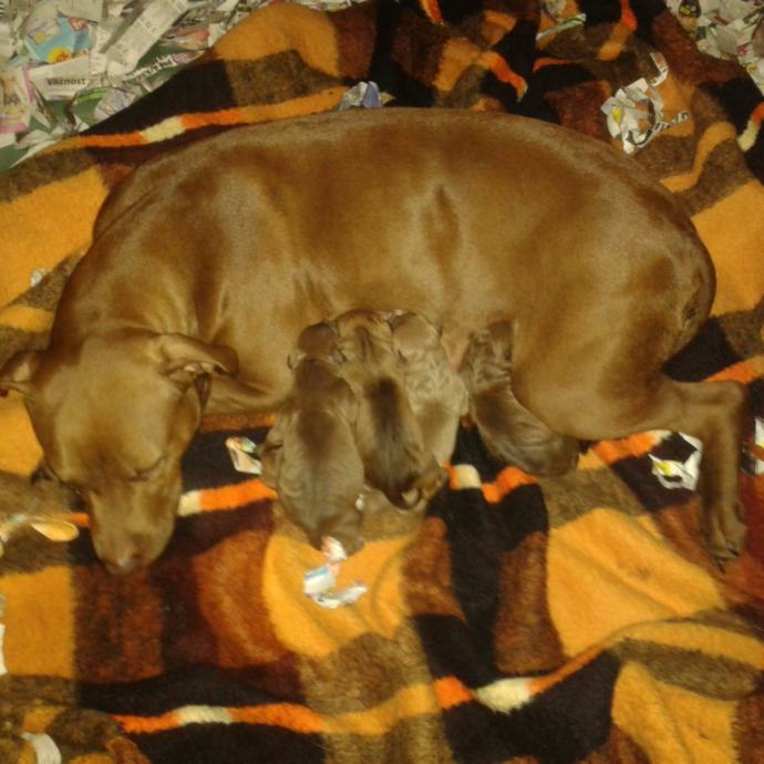Prednaruđbe za cistokrvne stence APBT rednose, oba roditelja na fotografijama i mogu se uzivo pogledat, zenka Liz i muzjak Daff, prvo leglo, kuja se okotila 17. 3. u jutarnjim satima, 5 je stenaca kao sto je vidljivo na slikama, 4 muskih i jedna kuja, cijena: zenke 1000 kn, muzjak 1500 kn, javiti se porukom prije poziva jer se ne javljam na nepoznate br., ne odg na email..