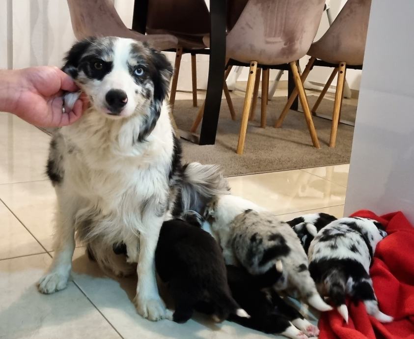 Leglo je oštenjeno 06.10.2025.godine. Majka pas je blue merle boje, dok je otac dugodlaki tricolor, bijelo-crno-smeđi. Za rezervaciju je još dostupan muški štenac (srce).