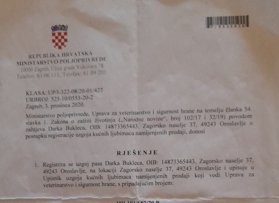 Uzgoj registriran u Ministarstvu poljoprivrede.