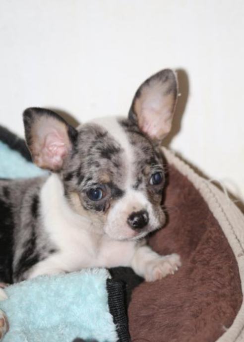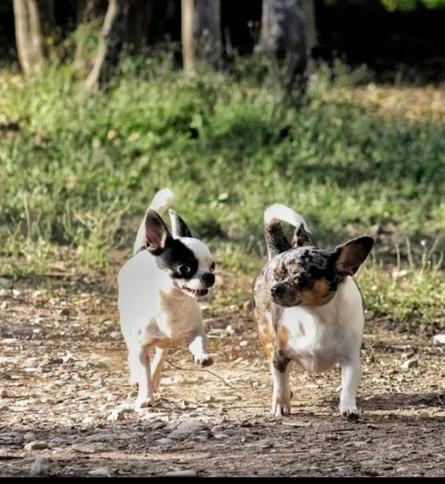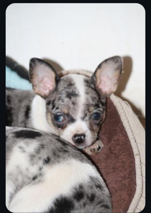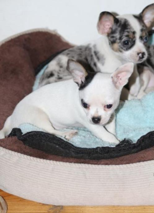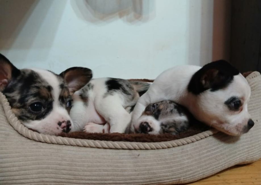 Chihuahua preslatke male buhtlice ,crno bijela curica i dva merle decka.Cijepljeni ,čipirani,očišćeni od parazita veseli i zaigrani spremni za novi dom 10.1.26.Roditelji prisutni ,zadnja slika.... Vise na wats app ili poziv na 0953983126