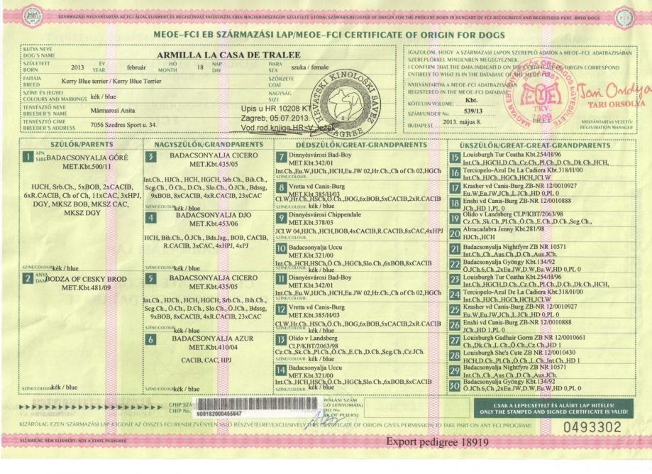 Majka štenaca: Armilla La Casa de Tralee, 5 x CAC, 3 x CACIB, 4 X JBOB, 6 X BOB, BOG III, CH M HR, CH HR