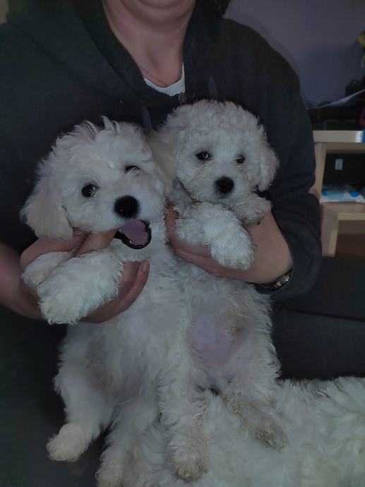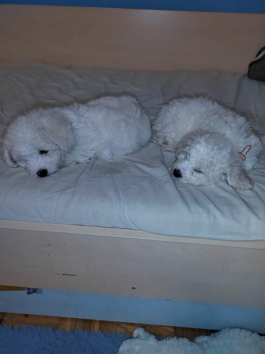 Štenci Kovrčavog bišona ( Bichon Frise) pasmina koja ne smrdi, ne linja se, anti alergijska. 2 muška šteneta, stari 2 mjeseca, cijepljeni, 3 puta očišćeni od parazita... Čistokrvni, bez papira... Moguća dostava... 0923592350